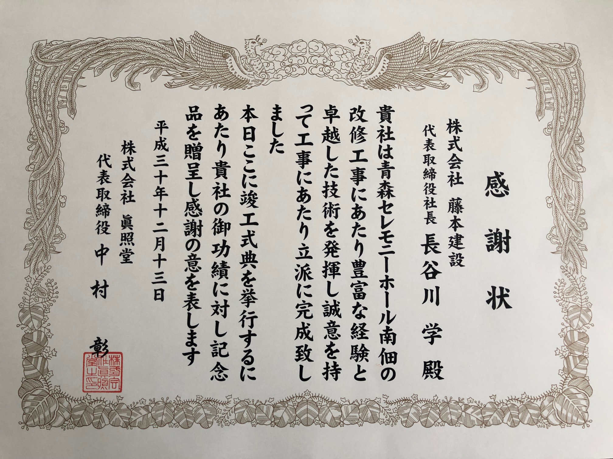 2018年12月13日青森市南佃2丁目の地に、当社で施工しました「青森セレモニーホール南佃」がオープン致しました。 ゆっくりと思い出を語らいお見送りができるような、心安らぐ空間になっております。 また、株式会社眞照堂 代表取締役 中村 彰様より、青森セレモニーホール南佃完成に貢献したとされ、 感謝状をいただきました。